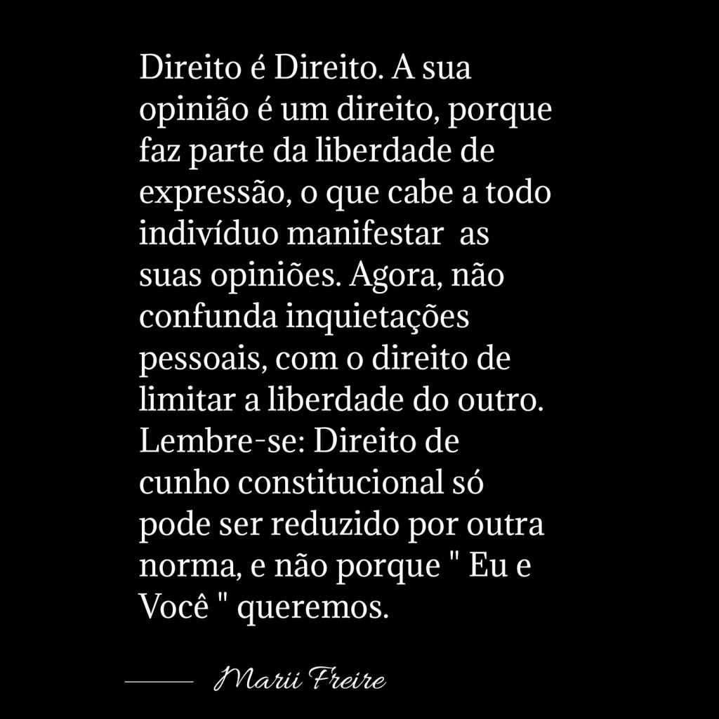 ” Direito é Direito. A sua opinião é um direito, porque faz parte da liberdade de expressão, o que cabe a todo indivíduo manifestar as suas opiniões. Agora, não confunda inquietações pessoais, com o direito de limitar a liberdade do outro. Lembre-se: Direito de cunho constitucional só pode ser reduzido por outra norma, e não porque ” Eu e você ” queremos.
