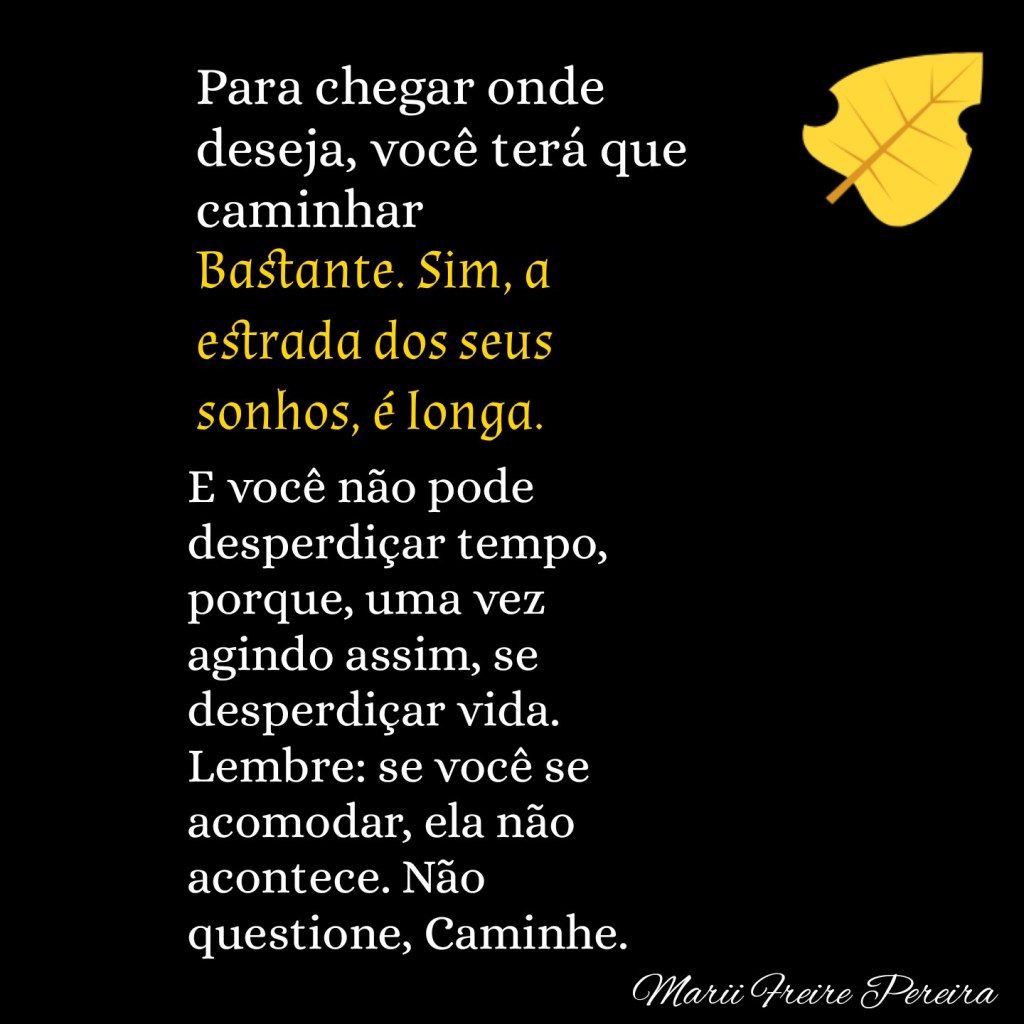 Para chegar onde deseja, você terá que caminhar bastante. Sim, a a estrada dos seus sonhos, é longa. E você não pode desperdiçar tempo,porque agindo assim, se desperdiça vida. Lembre-se: se você se aconda, ela não acontece. Não questione, Caminhe.