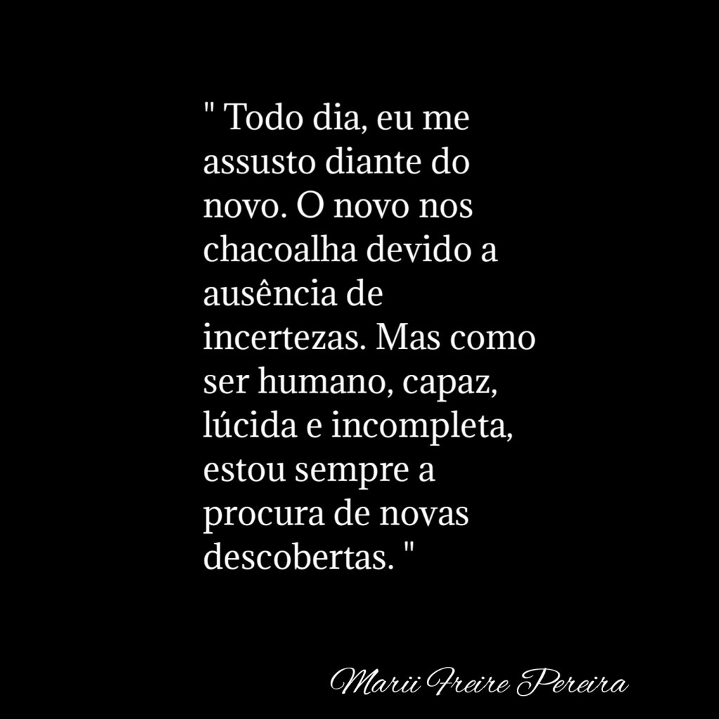 ” Todo dia, eu me assusto diante do novo. O novo nos chacoalha devido a ausência de incertezas. Mas, como ser humano, capaz, lúcida e incompleta, estou sempre a procura de novas descobertas. “