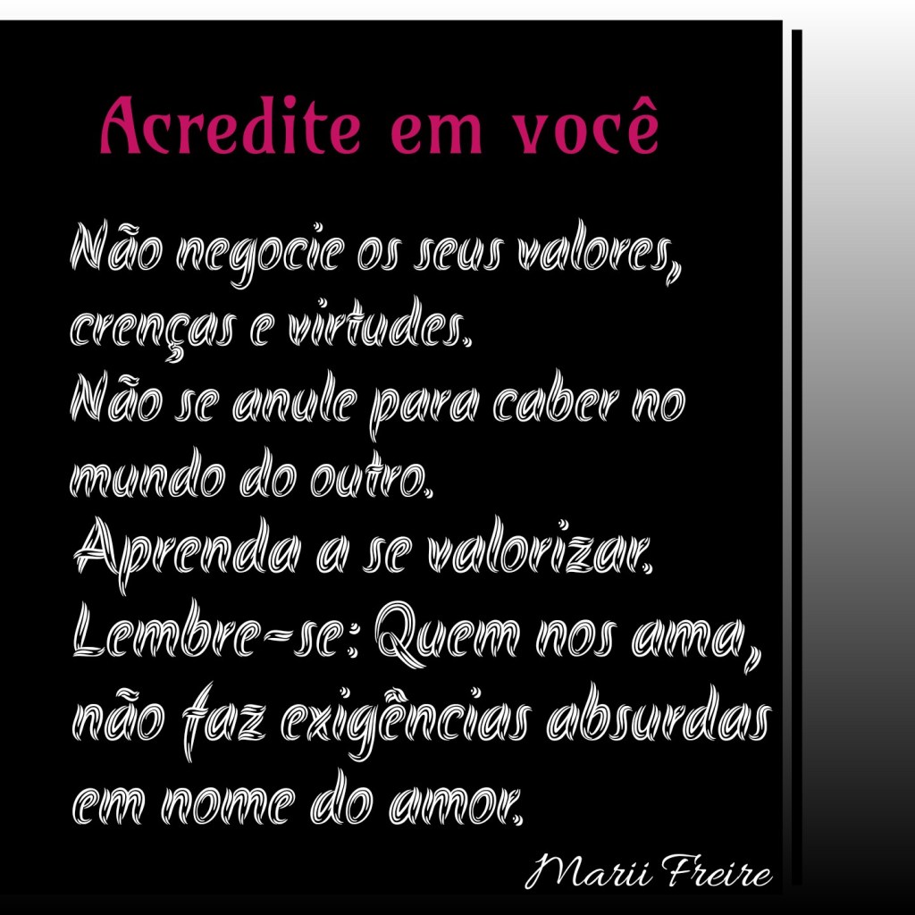 Não negocie os seus valores, crenças e virtudes. Não se anule para caber no mundo do outro. Aprenda a se valorizar. Lembre-se: Quem nos ama, não faz exigência absurdas em nome do amor.