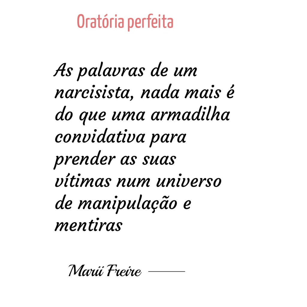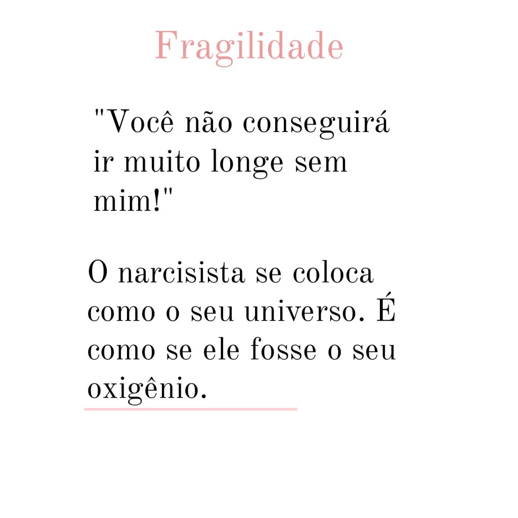 A frase mais comum que um narcisista fala quando manipula as suas vítimas é ” você é louca”, não diz ” nada com nada”. Claro – em geral, a vítima é a mulher na maioria das vezes, que movida pela emoção, se deixa cair no jogo de mentiras alicerçadas pelo narcisista. O que ele quer é gerar dúvida, deixar a pessoa fragilizada. Um narcisista ao se sentir contrariado é capaz de acabar com a duas imagem.