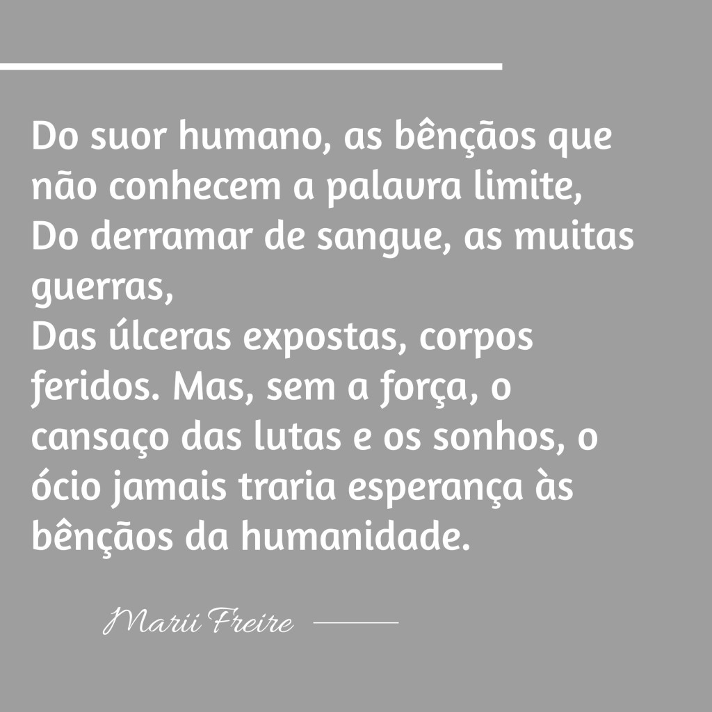 Das úlceras expostas, corpos feridos. Mas, sem a força, o cansaço das lutas e os sonhos, o ócio jamais traria esperança às bênçãos da humanidade.