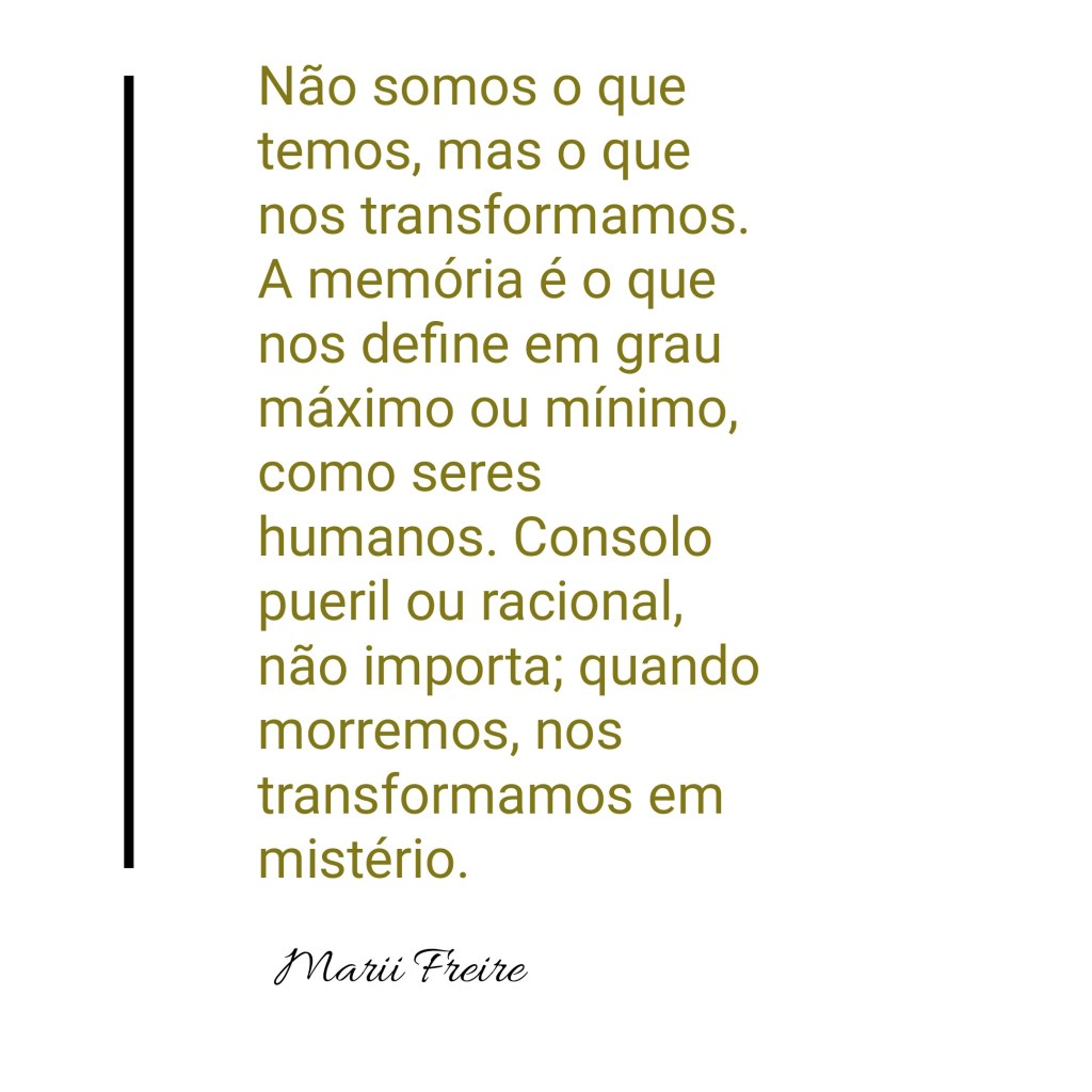 ” Não somos o que temos, mas o que nos transformamos. A memória é o que nos define em grau máximo ou mínimo, como seres humanos. Consolo pueril ou racional, não importa; quando morremos, nos transformamos em mistério. “