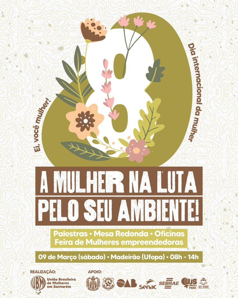 Eu recebi um convite especial da (UBM) União Brasileira de Mulheres/ Seção Santarém para fazer parte do evento ao Dia Internacional da Mulher, no dia 09 de março de 2024 ( sábado, 08h- 14h ) no Espaço Madeirão da UFOPA ( Campos Tapajós), onde o tema é: A Mulher na Luta pelo seu Ambiente. Haverá Palestras, Mesa Redonda, Oficinas, Feira de Mulheres empreendedoras.