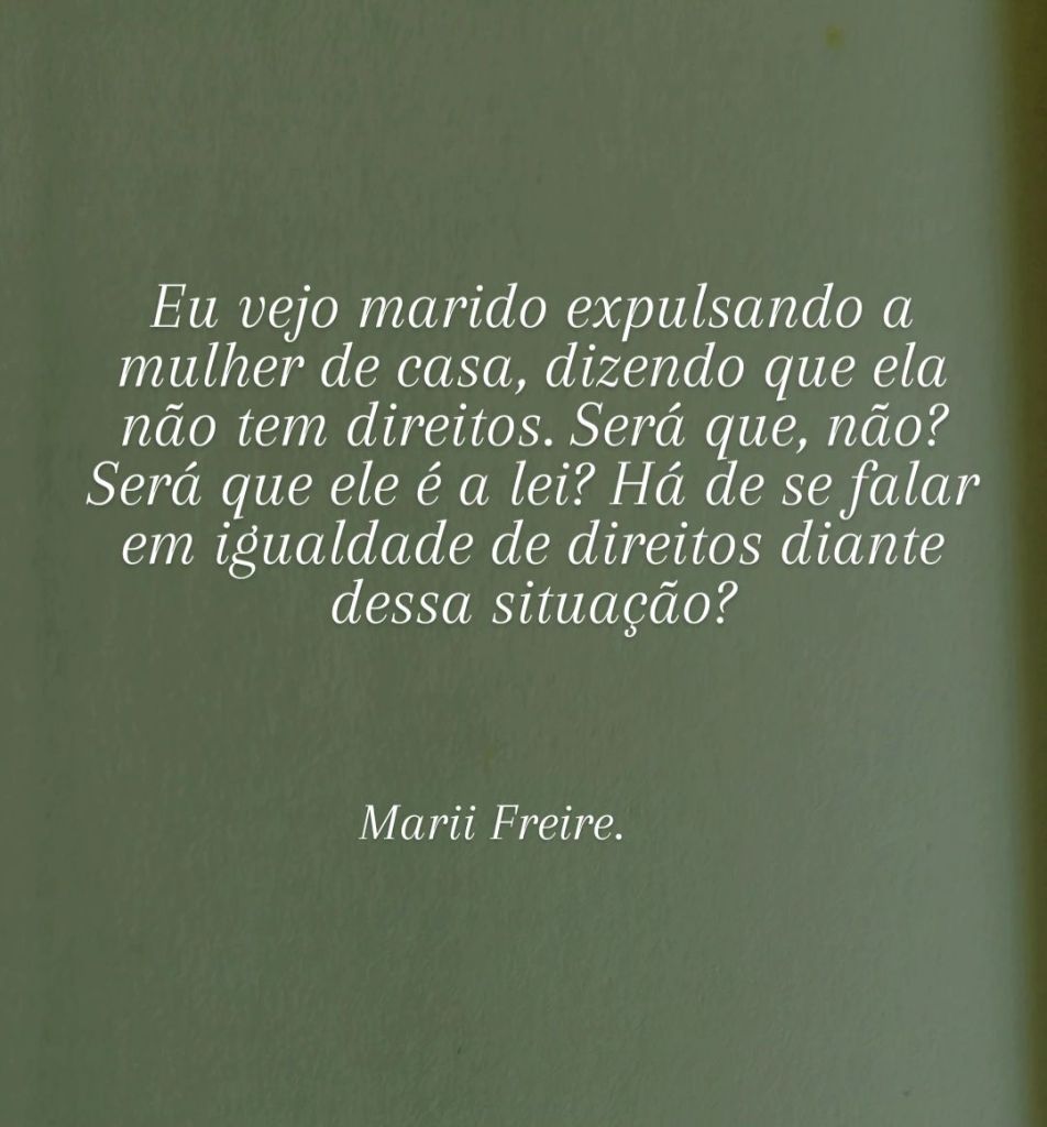 Eu vejo marido expulsando a mulher de casa, dizendo que ela não tem direitos. Será que, não? Será que ele é a lei? Há de se falar em igualdade de direitos diante dessa situação?