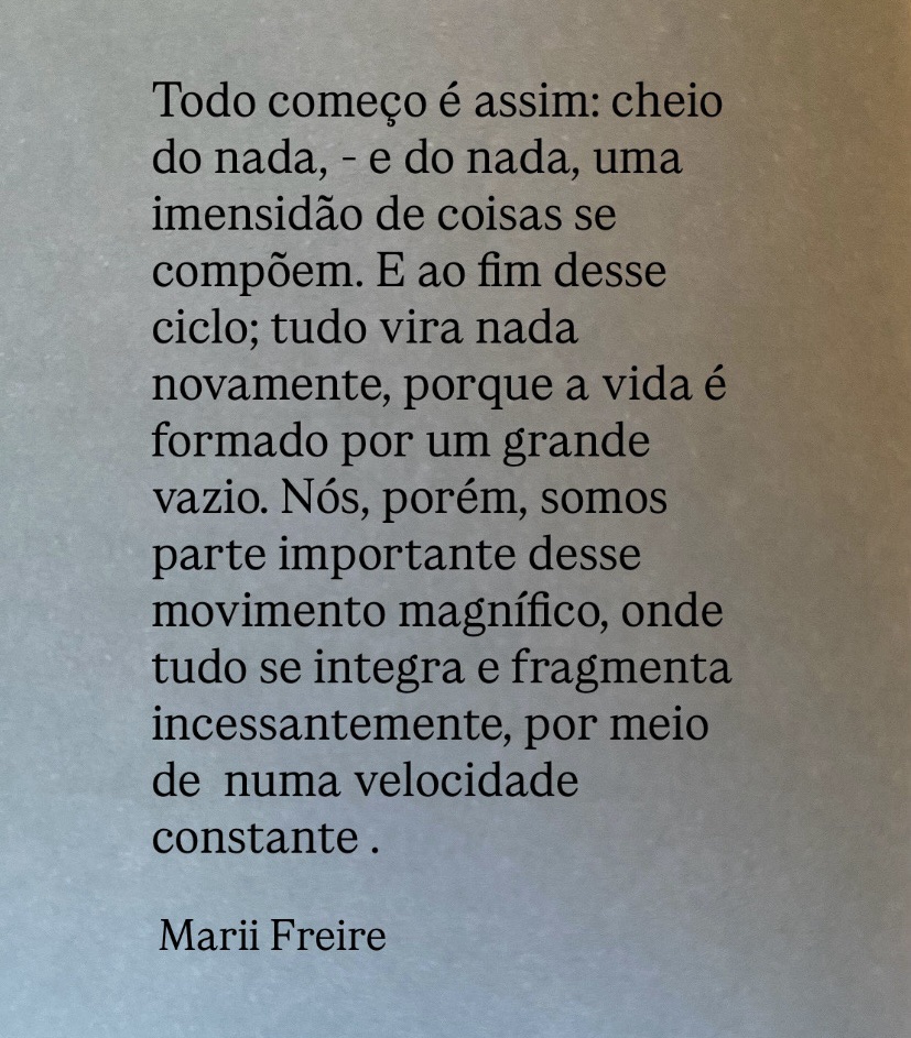 Todo começo é assim: cheio do nada, – e do nada, uma imensidão de coisas se compõem. E ao fim desse ciclo; tudo vira nada novamente, porque a vida é formada por um grande vazio. Nós, porém, somos parte importante desse movimento magnífico, onde tudo se integra e fragmenta incessantemente, por meio de uma velocidade constante.