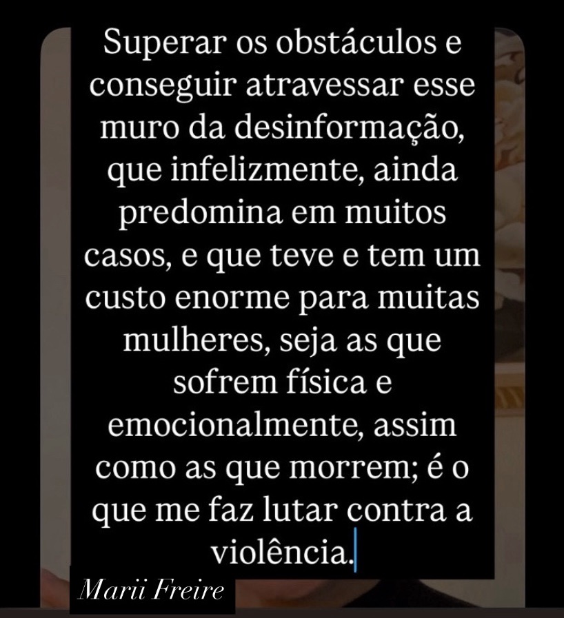 Superar os obstáculos e conseguir atravessar esse muro de desinformação, que infelizmente, ainda predomina em muitos casos, e que teve e tem um custo enorme para muitas mulheres, seja as que sofrem física e emocionalmente, assim como as que morrem; é o que me faz lutar contra a violência