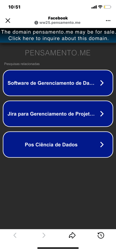 Hoje, quarta-feira, 8 de outubro de 2025 ao colocar naquela plataforma ( Facebook), a imagem que apareço e o fragmento do texto, como de costume, acrescento junto o endereço do blog, aparece um outro endereço que ( que não reconheço) que é: ( ww.25pensamentos.me ). Curiosa, ao clicar para entender do que se tratava, o mesmo leva para um informativo que o domínio de ( Pensamentos. me ) estaria à venda, como aparece na imagem azul, logo abaixo.