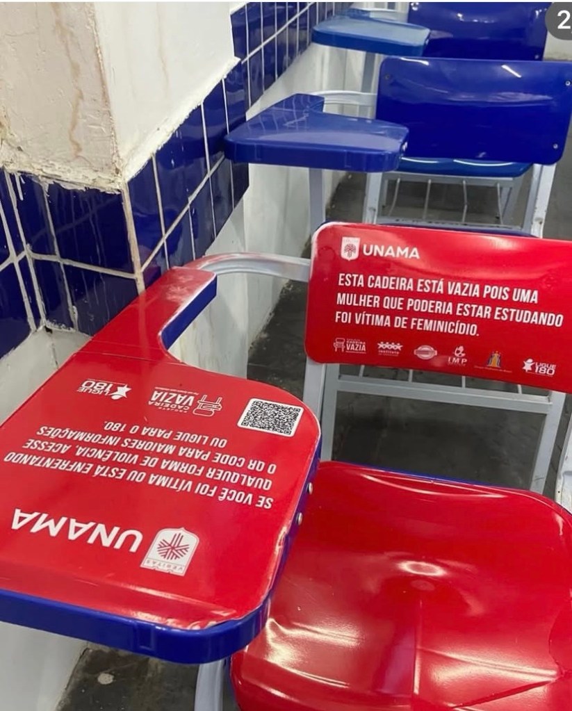 “ Está cadeira está vazia pois uma mulher que poderia estar estudando foi vítima de feminicídio.”