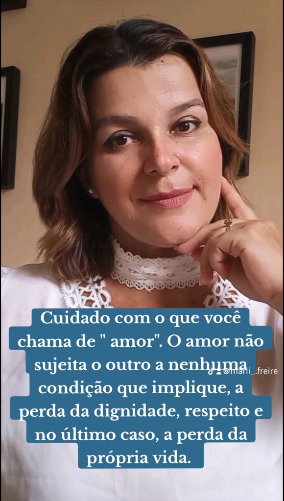 Cuidado com o que você chama de ” amor”. Isso mesmo que você leu! Tem muitas mulheres submetidas a condições desumanas para continuarem casadas. Há religião que encobre crimes quando dizem que a mulher deve orar, ao invés de encorajá-la a ir numa delegacia. Isso não tem relação com o fato de cumprir a vontade Divina, mas a condição imposta por homens a essas mulheres que raramente, esboçam algum tipo de reação.