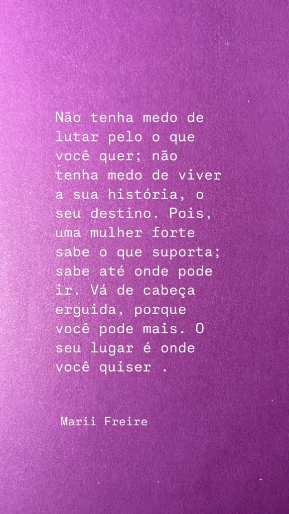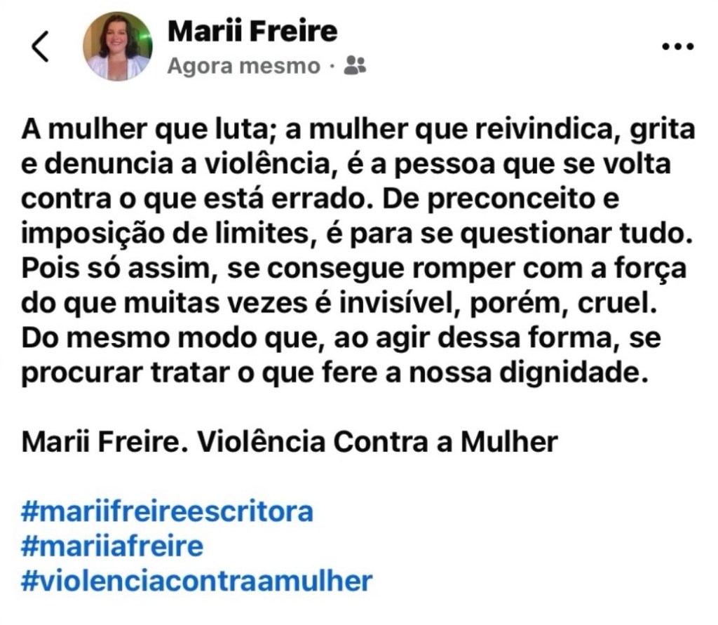 “ Não é porque eu te amo que vou deixar você falar comigo de qualquer forma”; tratar de qualquer maneira. O amor não é o bastante para certificar esse tipo de coisa; nem reprimir as emoções para que cenas de violência se repitam com constância. Veja, se uma mulher sofre violência e se submete a qualquer tipo de situação, o homem a mata – e quaisquer outros tipos de violência. Por isso, o recado que deixo é: diga “ não “ a violência.