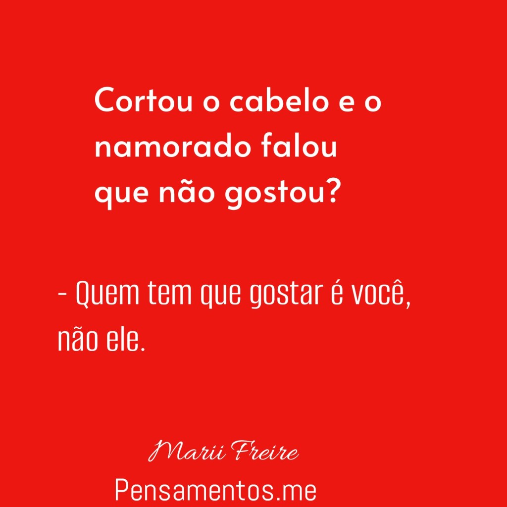 Cortou o cabelo e o namorado não aprovou? Ótimo. Não é ele que tem que gostar, é você que deve se sentir bem. Você tem que ser você, viver para agradar a si mesma. Você é um ser único, por isso deve saber o seu valor. Não precisa agradar a quem, nem se encaixar em padrões que a sociedade estabelece para se sentir “querida” por ninguém. Veja quanta gente é diferente de você, e todos tem o seu valor. É preciso se amar e dizer ” Eu me sinto bem dessa forma “. Ninguém é igual ao outro, somos ser diferentes. E a riqueza de cada um, existe exatamente por essa diferença.