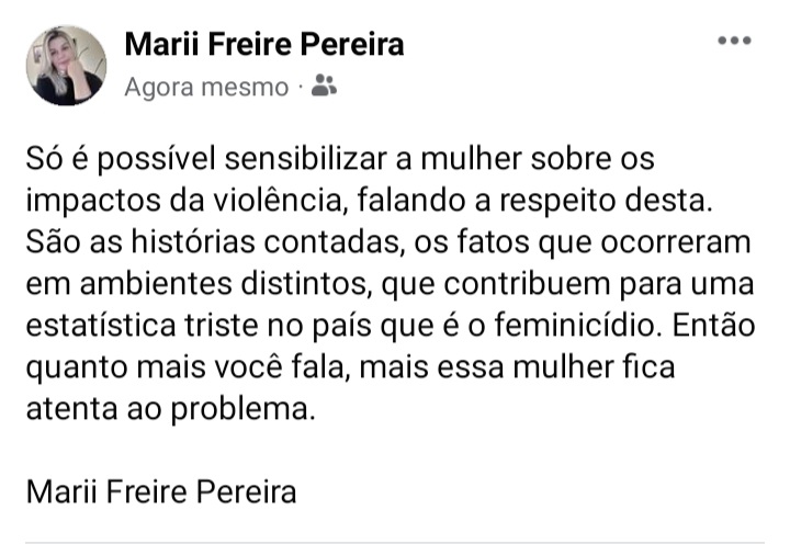 ” Só é possível sensibilizar a mulher sobre os impactos da violência, falando a respeito desta. São as histórias contadas, os fatos que ocorreram em ambientes distintos, que contribuem para uma estatística triste no país que é o feminicídio. Então quanto mais você fala, mais essa mulher fica atenta ao problema.