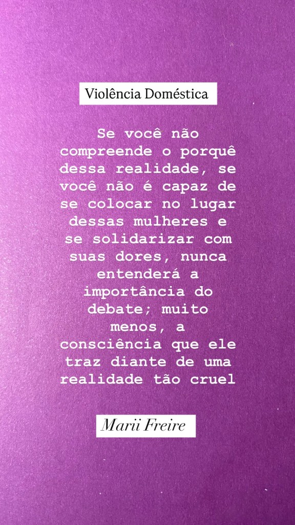 Quando a mulher apanha e encara isso como um sinal de perigo é ótimo, porque a dor se torna uma realidade que faz com que ela busque uma saída. Agora, quando apanha e o companheiro a convence que “ aquilo não foi nada” ou seja, existe o manejo da situação, é um problema. Pois, torna -se uma constante na vida dessa vítima.