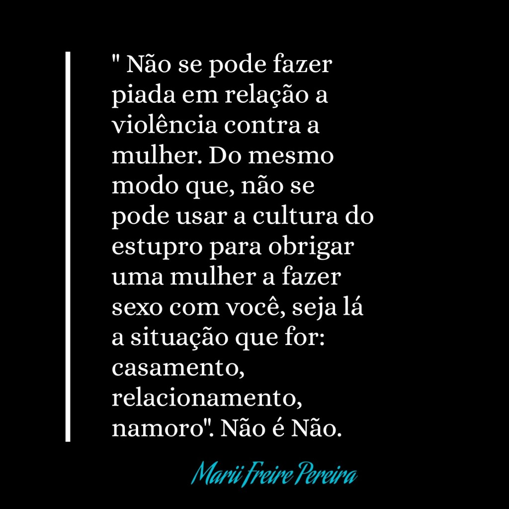 ” Não se pode fazer piada em relação a violência contra a mulher. Do mesmo modo que, não se pode usar a cultura do estupro para obrigar uma mulher a fazer sexo com você, seja lá a situação que for: casamento, relacionamento, namoro.” NÃO é Não.