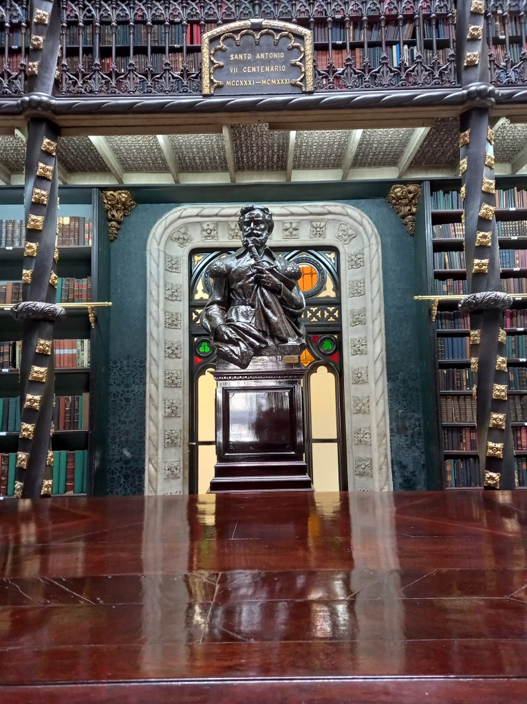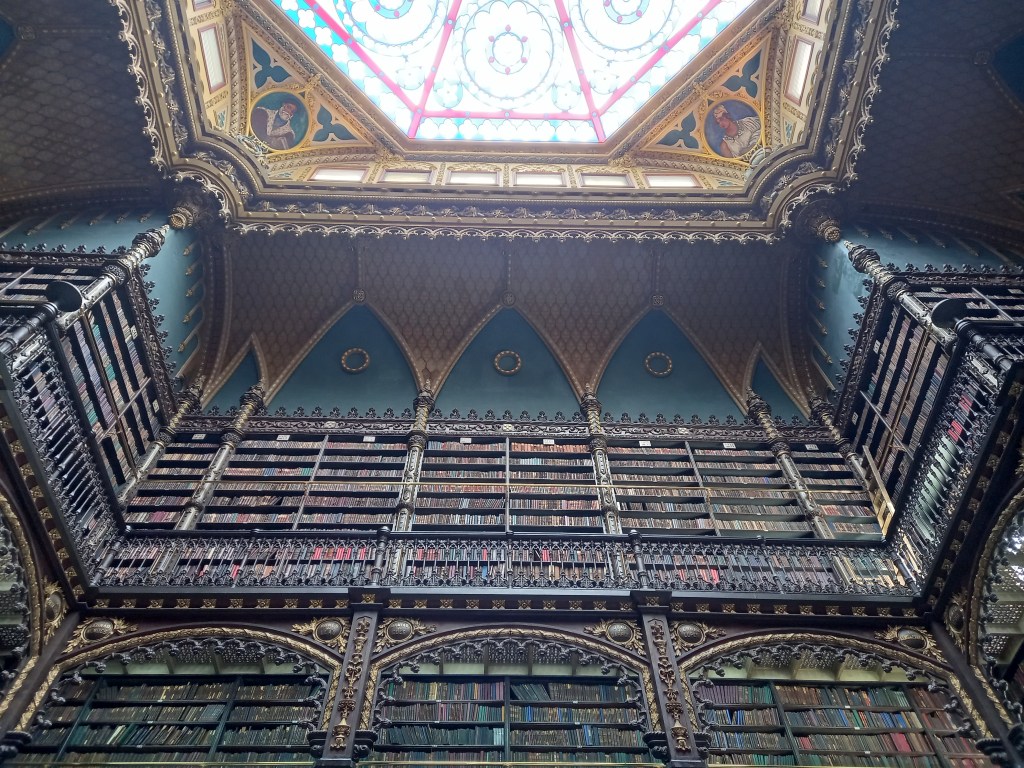 É ou não é um convite o lugar? Ah, esse detalhe que aparece refletido na imagem é o teto da biblioteca. O Real Gabinete Português entra na lista das mais belas bibliotecas como a Trinity College/ Dublim, a Biblioteca de Nova York e diversos outros exemplos espalhados pelo mundo.