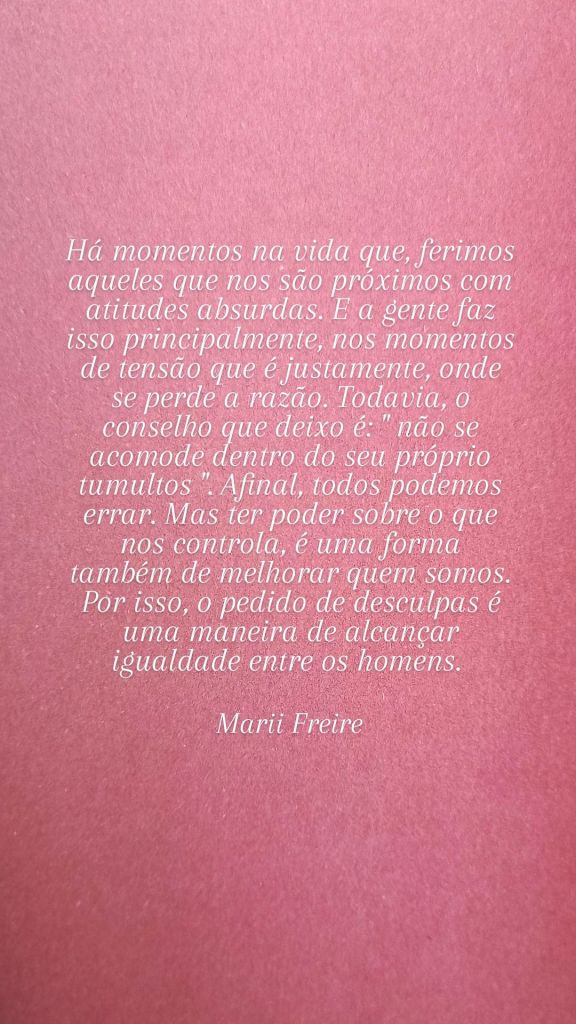 Há momentos na vida que ferimos aqueles que nos são próximos com atitudes absurdas. E a gente faz isso principalmente, nos momentos de tensão que é justamente, onde se perde a razão. Todavia, o conselho que deixo é: ” se acomode dentro de seus próprios tumultos ” . Afinal, todos podemos errar. Mas ter poder sobre o que nos controla, é uma forma também de melhorar quem somos. Por isso, o pedido de desculpas é uma maneira de alcançar igualdade entre os homens.