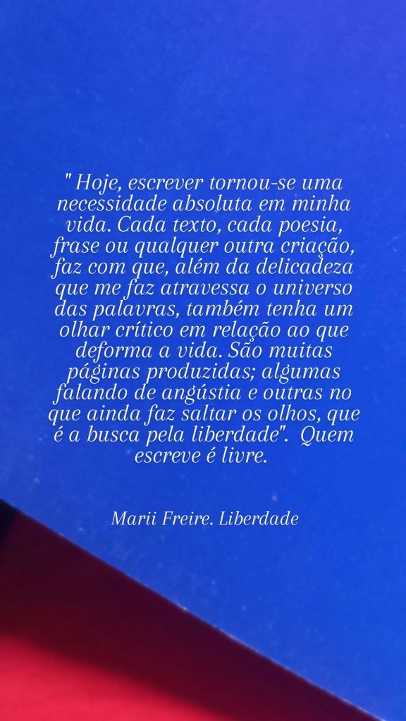 ” Hoje, escrever tornou-se uma necessidade absoluta em minha vida. Cada texto, cada poesia, frase ou qualquer outra criação, faz com que, além da delicadeza que me faz atravessar o universo das palavras, também tenha um olhar crítico em relação ao que deforma a vida. São muitas páginas produzidas; algumas falando de angústia e outras no que ainda me faz saltar os olhos, que é a busca pela liberdade ” . Quem escreve é livre.